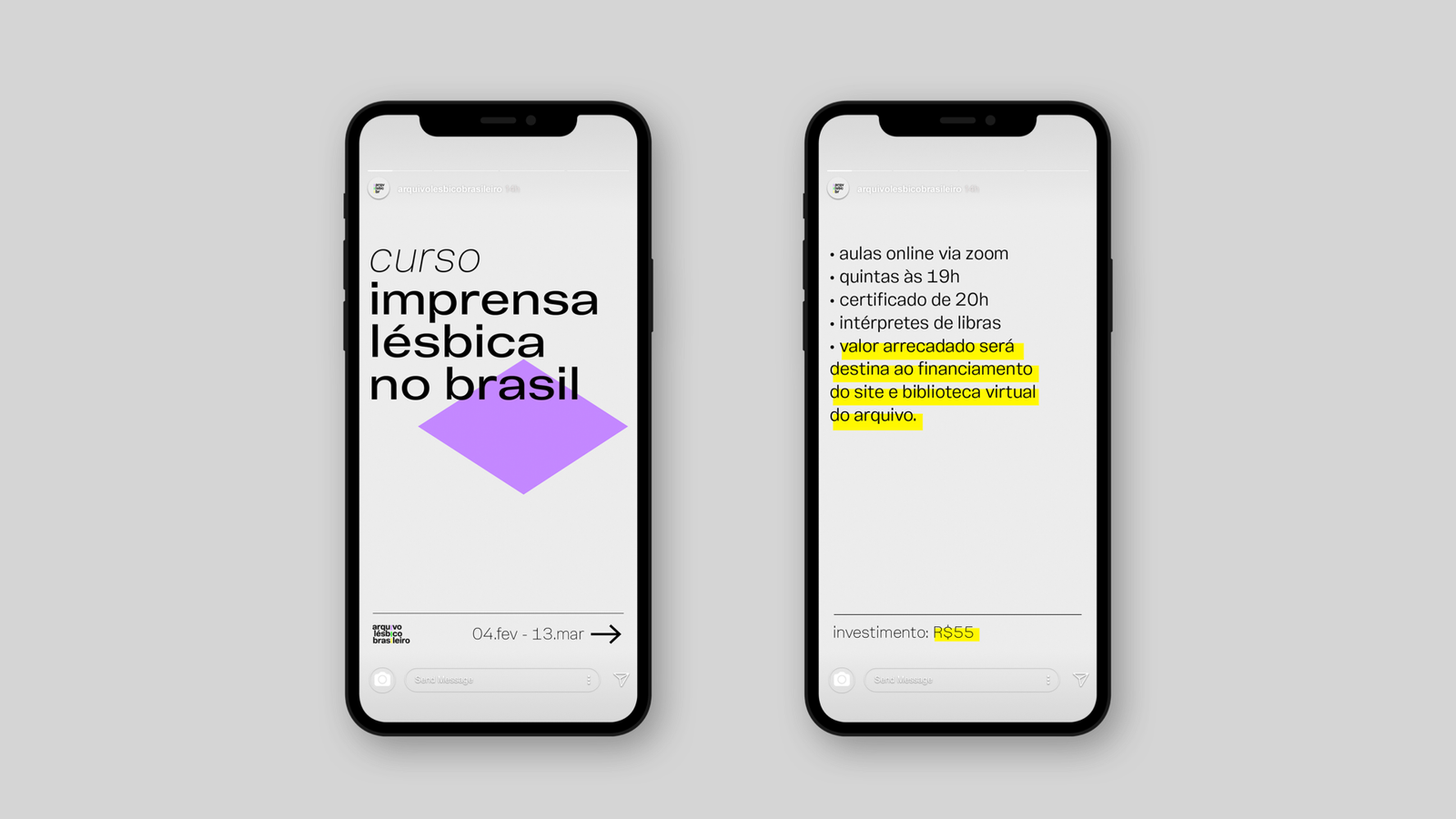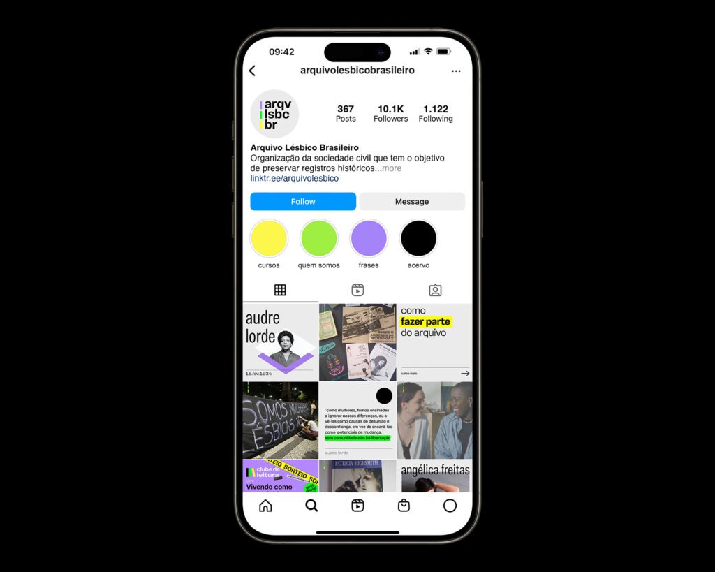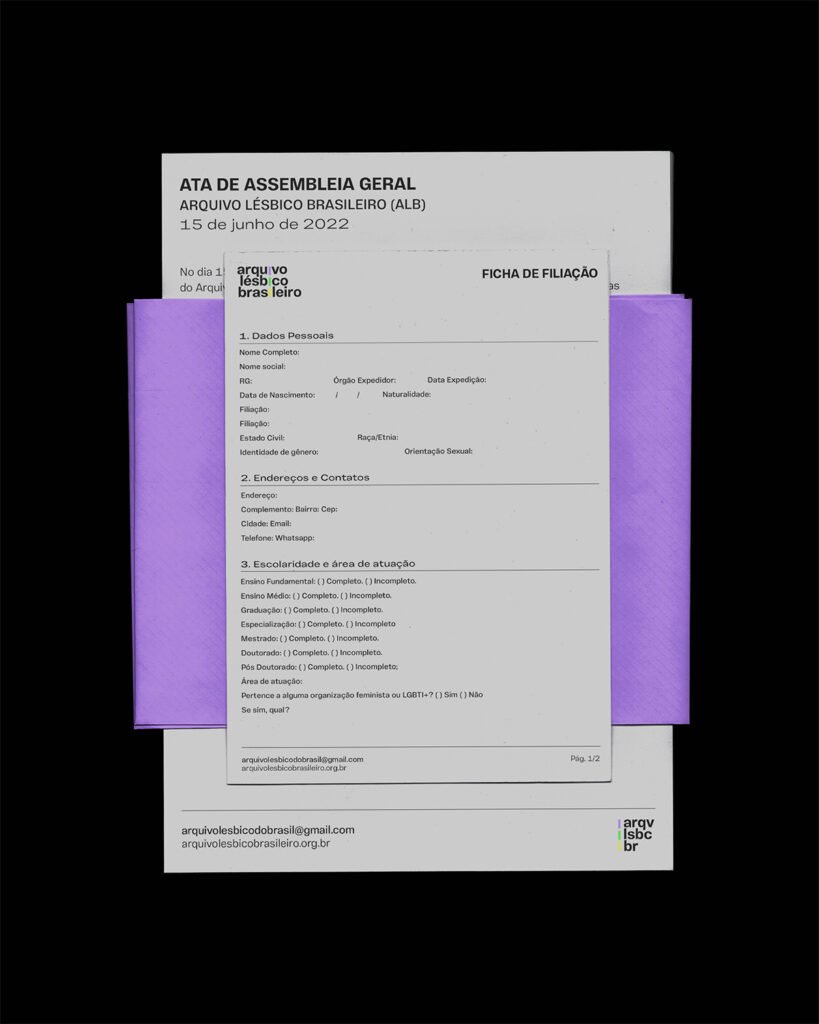 O Arquivo Lésbico Brasileiro é uma organização civil dedicada a preservar registros históricos e culturais sobre lesbianidades. A identidade visual foi criada para refletir a continuidade e resistência da luta lésbica, com uma linha pontilhada que conecta as palavras do nome, sugerindo um caminho que está sendo simultaneamente trilhado e construído. Em sua linguagem visual, elementos da bandeira brasileira foram desconstruídos e combinados ao triângulo invertido, símbolo icônico da luta lésbica-feminista.